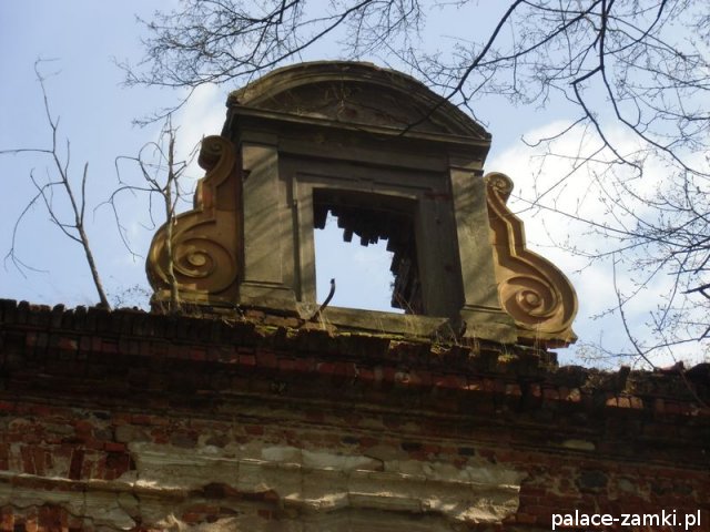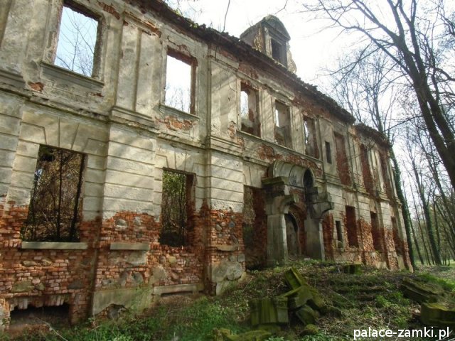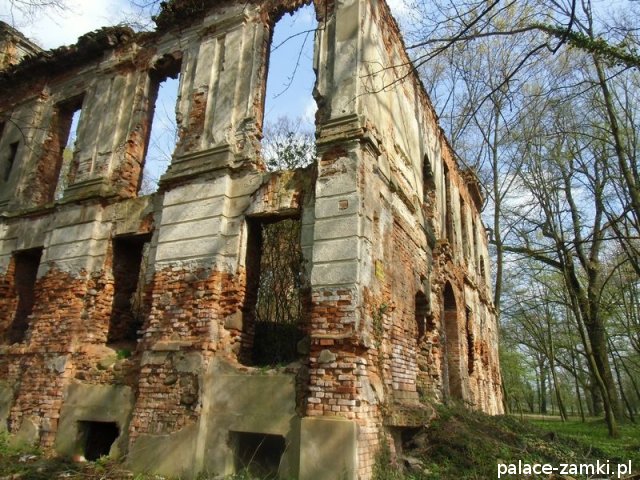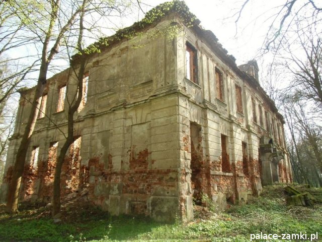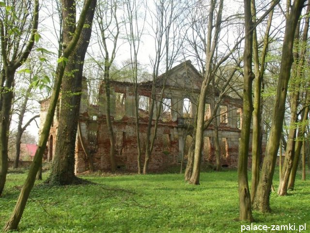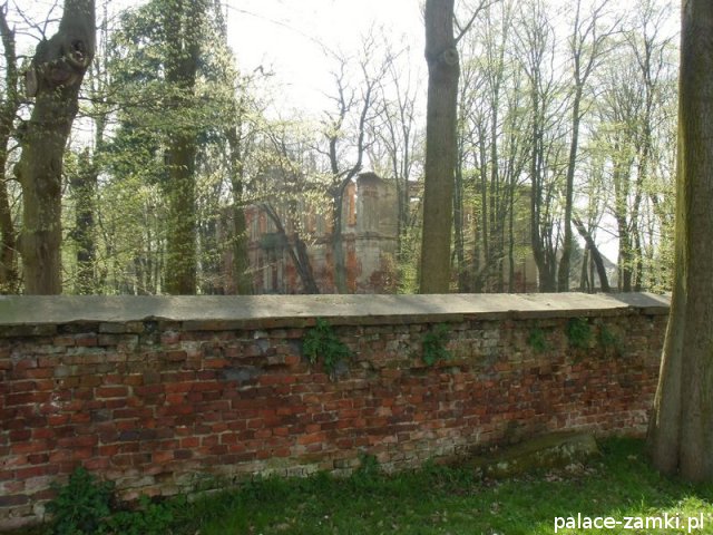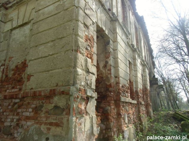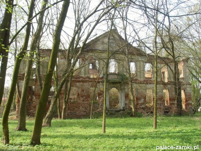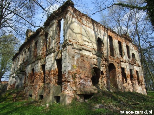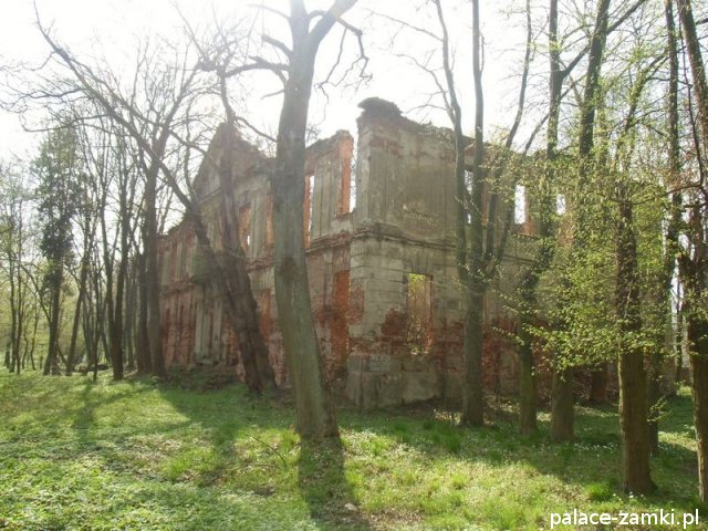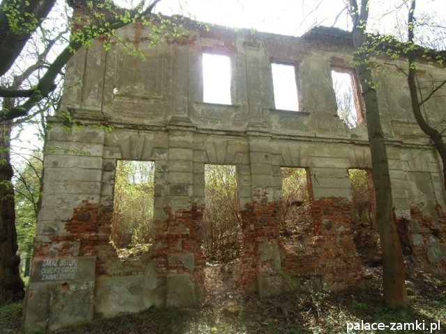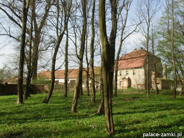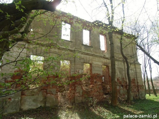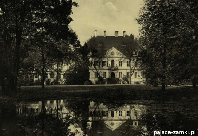 Pałac wzniesiono w 1725 roku dla rodziny von Nostitz i w ich posiadaniu był do roku 1792. W początku XIX wieku był przebudowany przez ówczesnych właścicieli, rodzinę von Prittwitz. Pałac jest budowlą dwukondygnacyjną o rzucie prostokątnym i założeniu dwutraktowym, z pilastrowym podziałem elewacji. Całość była przykryta czterospadowym, ceramicznym dachem mansardowym z lukarnami. Na uwagę zasługuje bogato zdobiony, piaskowcowy portal głównego wejścia, oraz kartusz herbowy. Od czasu przebudowy w 1906 roku do pałacu od strony południowej przylegał tzw. dom kawalerów. W 1851 r. właścicielem rezydencji był kapitan Gustaw Brüstlein, a w latach 1901-1905 rotmistrz Herman Pratsch. Rozbudowy pałacu dokonał kolejny właściciel, kapitan Gotthard Wirtsch, który przebywał tutaj od 1905 r. do 1922 r. Prawdopodobnie wówczas pałac skierowano fasadą frontową na wschód, w stronę parku. Pierwotnie, bowiem fasada frontowa zwrócona została na zachód, ku rozległemu dziedzińcowi folwarcznemu. Pośrodku dziedzińca, na osi rezydencji usytuowano owalny basen. Do dziś zachowały się zabudowania gospodarcze oraz pozostałości fontanny. W parku zachowało się również sporo ciekawych okazów drzew jak: dęby, platany, graby, a także pomnikowe dziś żywotniki olbrzymie (tuje) i cyprysiki groszkowe. W styczniu 1945 roku wieś znalazła się w pasie ciężkich walk frontowych i kilkakrotnie przechodziła z rąk do rąk walczących stron. Zniszczeniu uległ wówczas pałac i od tamtej pory, pozbawiony jakiejkolwiek opieki pozostaje w stanie zaawansowanej ruiny.