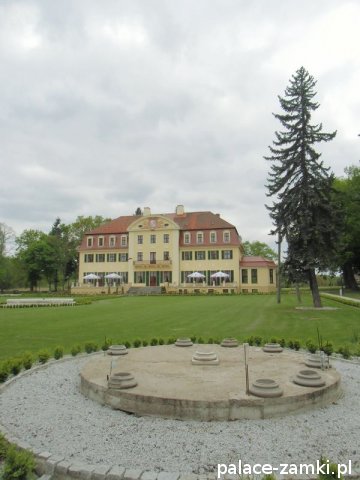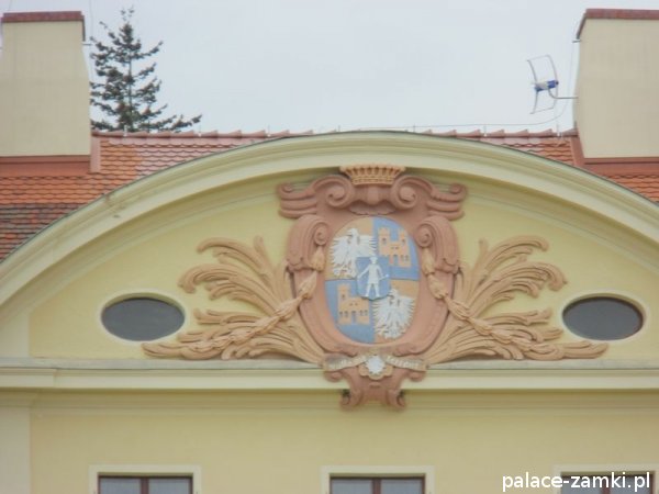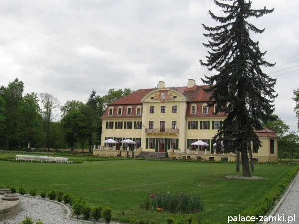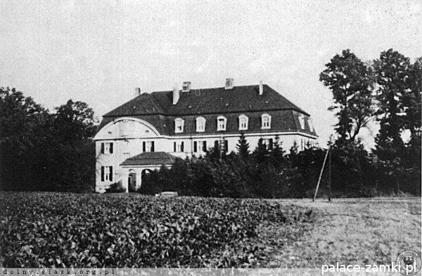Od strony frontowej rezydencja poprzedzona jest zadaszonym na wysokości pierwszego piętra gankiem. Natomiast w elewacji ogrodowej znajduje się niewielki ryzalit zwieńczony półkolisty tympanonem z herbem rodowym właścicieli i dewizą "Nulla me terrent", czyli "Niczego się nie boję". Całość nakryto dachem mansardowym z lukarnami, a wokół pałacu rozciąga się park krajobrazowy. W czasie wojny w pałacu urządzono lazaret (szpital wojskowy) i ośrodek dla rekonwalescentów armii niemieckiej.