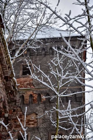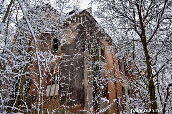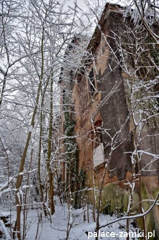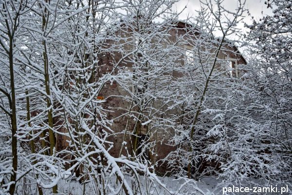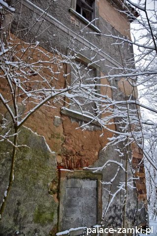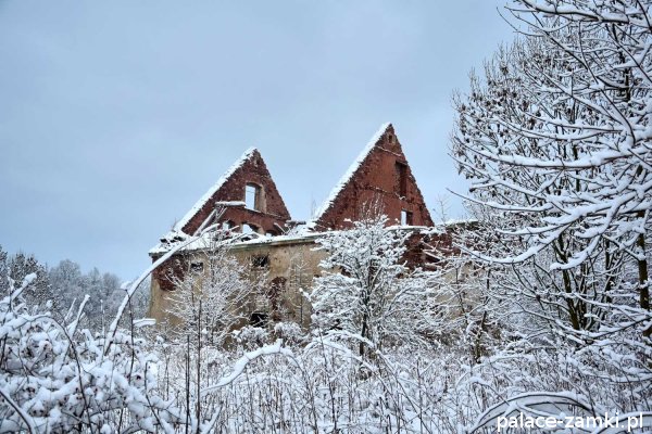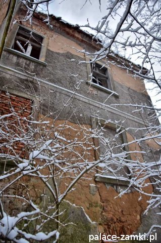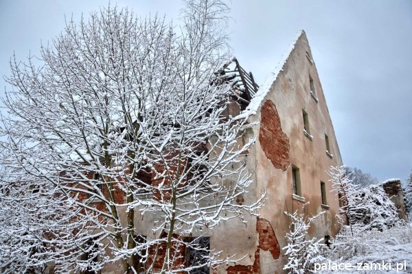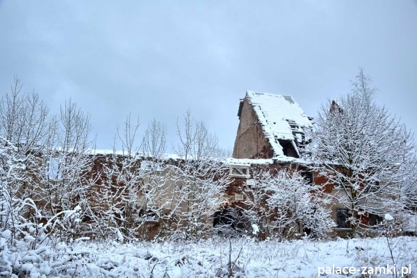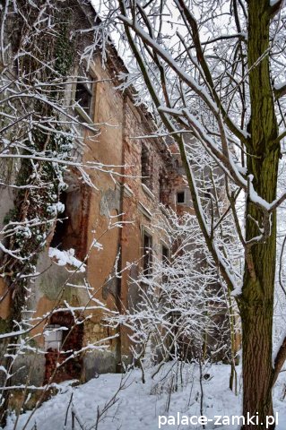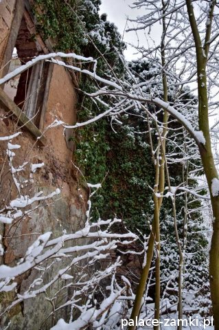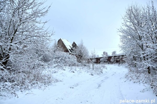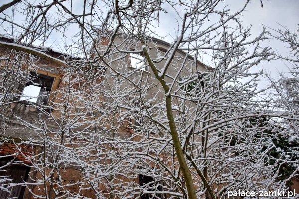 Pałac, mimo, że nie jest jakąś wielką budowlą, to nas w jakiś sposób zachwycił- może to zimowa pora dodała temu miejscu uroku, a może usytuowanie zespołu pałacowego. Budynki pałacu i gospodarcze wybudowano na wzniesieniu- każdy praktycznie na innym poziomie. Pałacowy park znajduje się na najniższym poziomie zespołu, trochę wyżej znajduje się budynek pałacu, wyżej znajduje się oficyna mieszkalna, a jeszcze wyżej i wyżej: budynek gospodarczy, stodoła, obora i spichlerz. Zapewne taki układ gwarantuje osłonę budynku pałacu od wiatrów wiejących od gór, a dzięki temu było w nim cicho i ciepło.