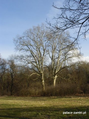 Przed pałacem znajdował się parter ogrodowy. Jak można było sobie wyobrazić po środku stała fontanna po której dziś śladu nie ma. Park posiadał swobodnie rosnące drzewa i krzewy oraz pojedyncze okazy starodrzewu. Można śmiało powiedzieć, że mają ponad 180 lat. Przepiękną kompozycję parkowo – ogrodową wzbogacały wodne tafle fos przypałacowych i drobne kompozycje ogrodowe z grzędami ozdobnych krzewów i grupami kwitnących kwiatów.