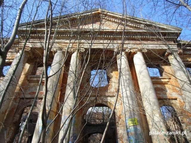 Gdy już dotarliśmy na drugą stronę pałacu, jak się okazało frontową, widok zaparł nam dech w piersiach. Wielki i wspaniały, który ocalał do czasów obecnych, portyk 6 kolumnowy, który świadczy o świetności niegdyś tego ogromnego pałacu. Wygląda to jak rodem z architektury Greckiej.