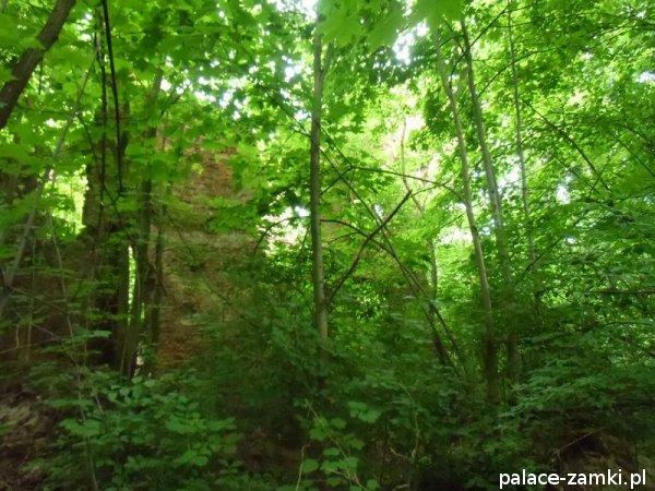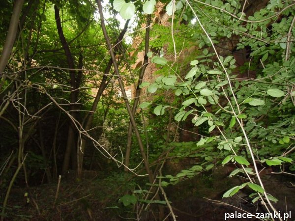 Wysiadając z samochodu trafiliśmy na wielką ścianę dzikiej roślinności. Można powiedzieć, że dzięki zimowej porze roku znaleźliśmy te ruiny. Od strony drogi zza krzaków wyłoniła się zmasakrowana bryła, która jest cieniem dawnego pałacu – widok nie zachwycał, zwykły dom mieszkalny z fosą. Zaczęliśmy szukać wejścia na drugą stronę. Przedzieraliśmy się przez wielkie krzaki, a jak się później okazało, można było wejść innym wejściem- dróżkę tą zasłaniały drzewa i do wybrania jej zniechęcała błotnista polana, przez którą owa dróżka wiodła.