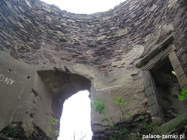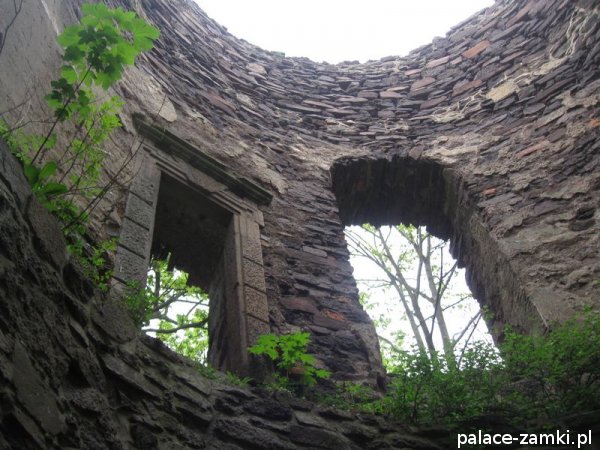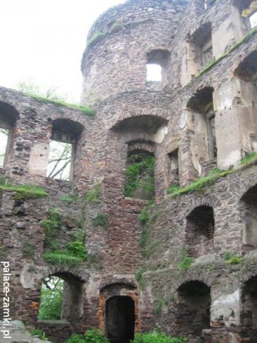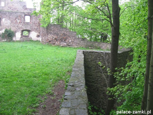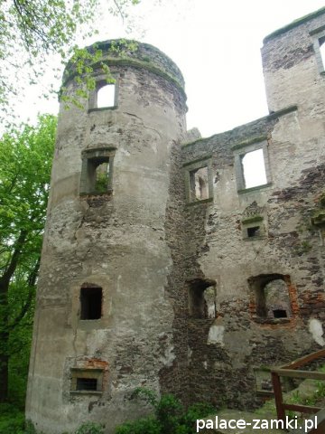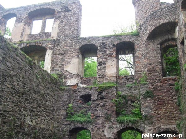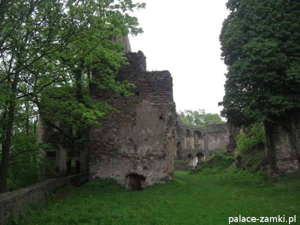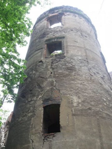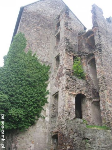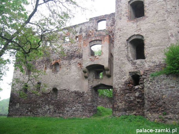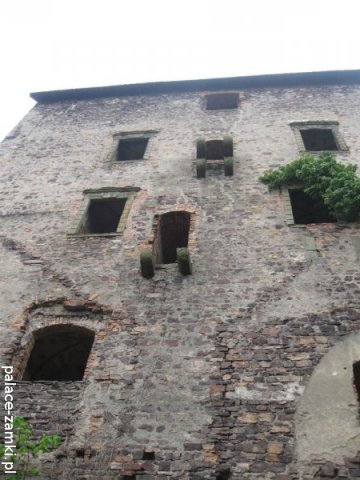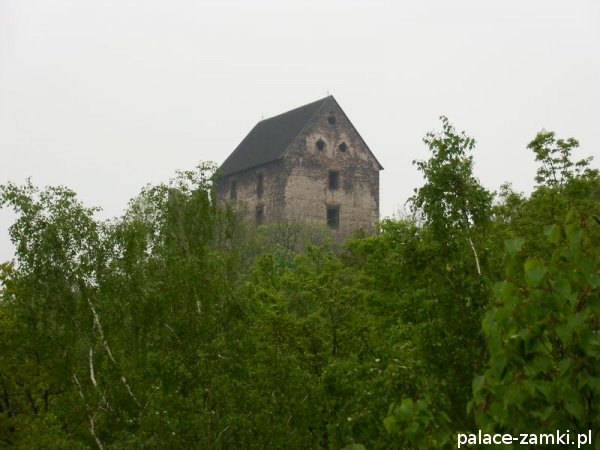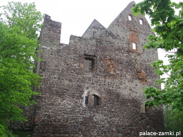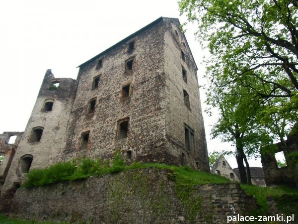 Na miejscu drewnianego grodu w połowie XIV wieku Świnkowie stawiają wykonaną z łamanego kamienia masywną, o 2,5 metrowej grubości murów wieżę mieszkalną, otoczoną murem obwodowym. Podpiwniczona wieża była postawiona na planie prostokąta o wymiarach 12 x 18 metrów i była nakryta dwuspadowym dachem. Wejście do wieży prowadziło przez zachowany do dzisiaj gotycki portal, na parterze mieściła się sala rycerska, a na wyższe kondygnacje prowadziły drewniane schody.